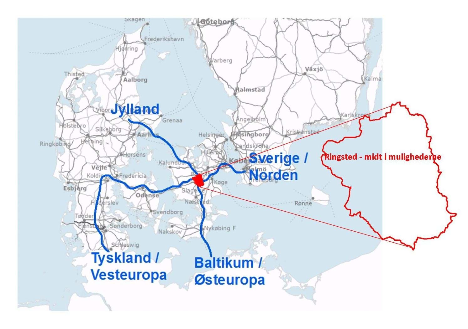 Den fysiske placering midt på Sjælland betyder, at der er kort til alting. Jylland, Sverige, og Tyskland kan nås inden for et par timer. København, Køge, Roskilde, Holbæk, Slagelse og Næstved kan nås inden for ½ time. De regionale og nationale hovedfærdselsårer ligger ”lige uden for døren”. Adgangen til øst / vest forbindelsen udbygges i de kommende år med en nord / syd forbindelse, og Ringsted kommer til at ligge lige, hvor disse forbindelser krydser. Dermed bliver Ringsted det naturlige knudepunkt, som kan levere nem adgang til hele verden. Positionen forstærkes af de statslige investeringer i ny infrastruktur.