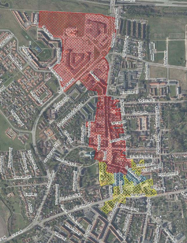 Kortet viser Ringsted Bymidte. Der er forskellige regler for hvert af de farvede områder. I det røde område skal der placeres aktiviteter, der har åbent i butikkernes sædvanlige åbningstider. I det blå område skal der placeres aktiviteter svarende til det røde område eller serviceerhverv. I det grønne område kan der placeres aktiviteter som i de to øvrige områder, og der kan også placeres boliger.