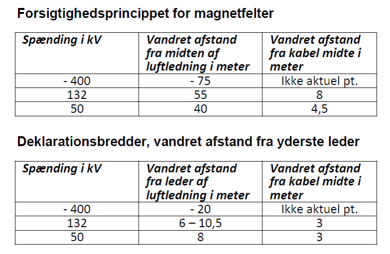 I tabellerne herunder er angivet forsigtighedsprincippet i forhold til magnetfelter samt deklaration- og tracébredder for elledninger.