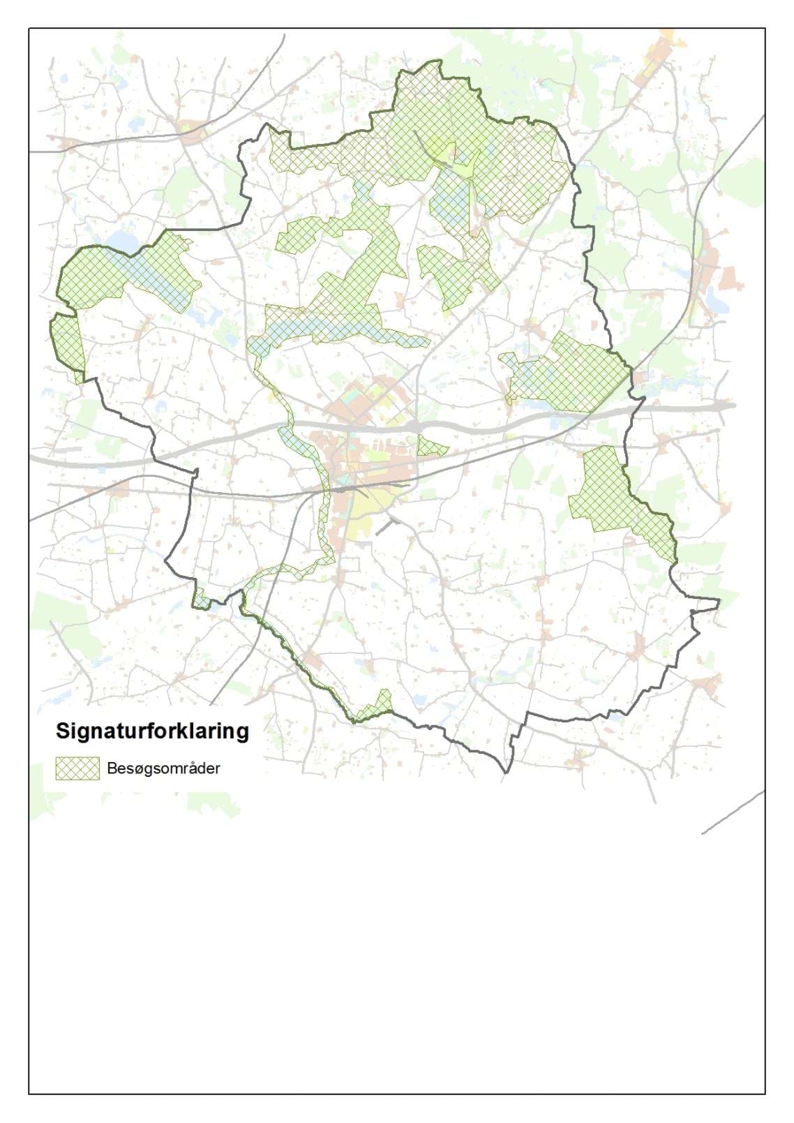 Besøgsområderne ligger i tilknytning til de mest attraktive rekreative områder og er egnede til ekstensivt, ikke særligt anlægskrævende friluftsliv. I besøgsområder skal der især være fokus på at etablere stier, støttepunkter for ophold (borde og bænke, bålsteder og lignende), fugletårne, mindre parkeringspladser, informationstavler, minimuseer, spejderhytter, lejrhytter, teltpladser, sheltere, naturskoler, mindre friluftsgårde og lignende.