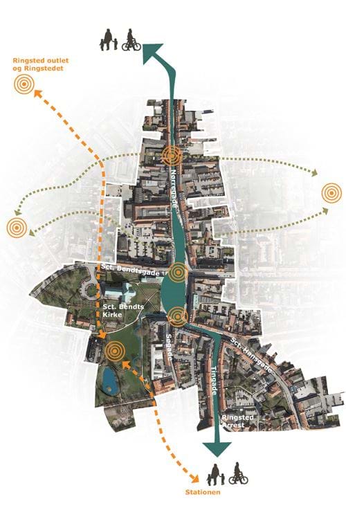 - Ringsted Kommune vil udvikle Ringsted bymidte til en mere sammenhængende og levende bymidte. Det vil vi gøre ved at udnytte og aktivere bymidtens uudnyttede baggårde med boliger, byfunktioner, byrum, der skaber byliv, Samtidigt vil vi skabe forbindelser i, på tværs og omkring bymidten med et fokus på de bløde trafikanter, der gør bymidtens mange tilbud mere tilgængelige særligt på cykel eller til fods.