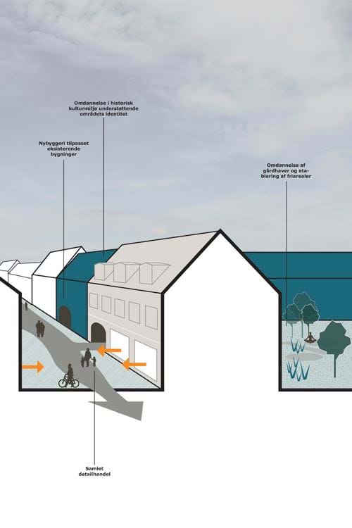 Bymidten har flere uudnyttede potentialer i form af skjulte baggårde, historiske kulturmiljøer og arkitektoniske bygninger placeret direkte ud til hovedstrøget. En omdannelse og byfortætning i bymidten i tråd med byens ånd er med til at forstærke byens identitet og skabe grundlag for mere mangfoldighed.