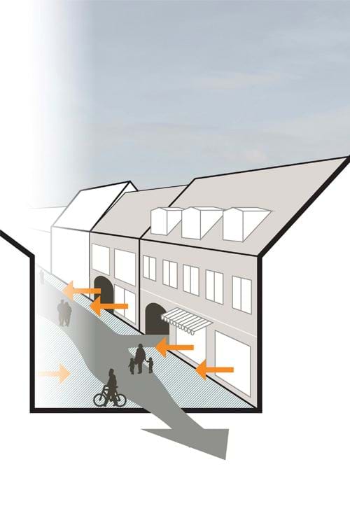 Placeringen af liberalt- og serviceerhverv i forbindelse med bystrøget er ligeledes med til at understøtte kontakt mellem mennesker, der bevæger sig i gaderummet.