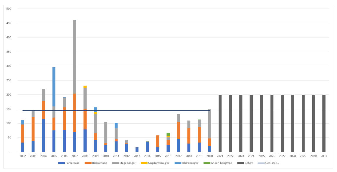 Sammenligner man det med den forventede befolkningsvækst på 3.411 borgere eller 1.705 boliger de næste 12 år stemmer det historiske gennemsnitlige antal byggede boliger i store træk overens med den forventede befolkningstilvækst.