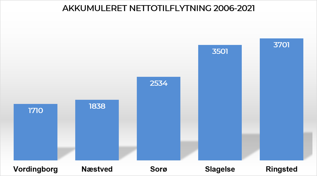 Set over perioden 2006-2021 har Ringsted haft en akkumuleret befolkningstilvækst på 3701 borgere, hvilket er et godt stykke foran nogle andre købstadskommuner i Region Sjælland.