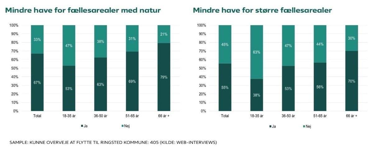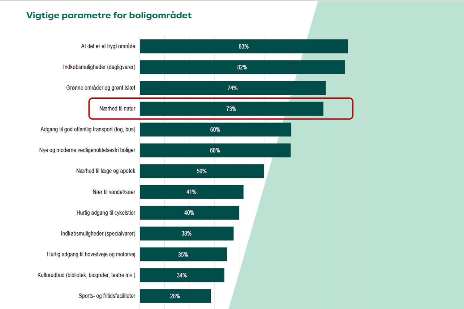 Grønne områder er det, vi ser ud på i hverdagen, der hvor vi færdes dagligt, og hvor vi sender vores børn ud for at lege. Bosætningsanalysen viser at et stort antal borgere gerne vil have mindre haver, hvis områdets fællesarealer til gengæld indeholder mere natur.