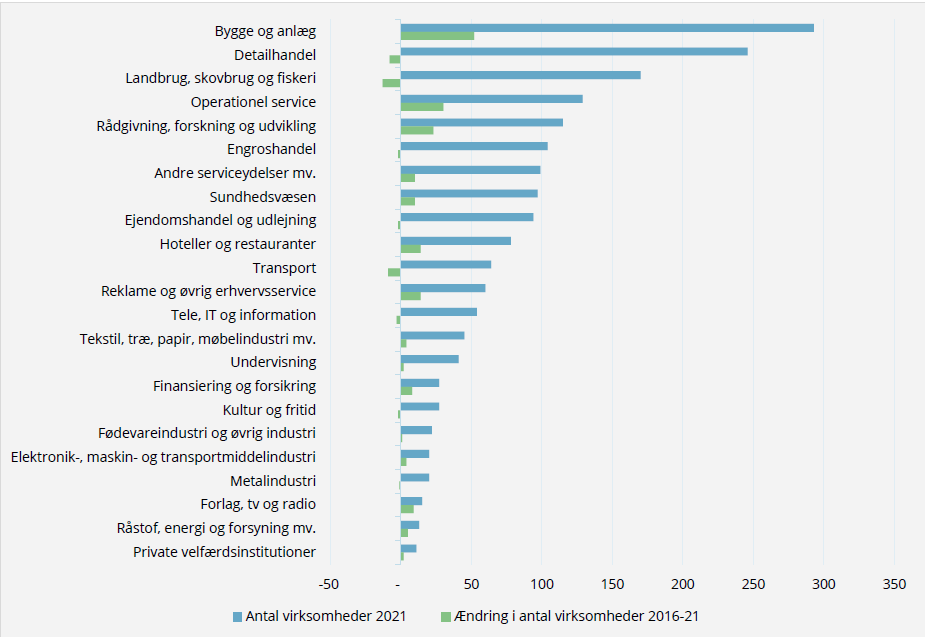 Kortlægningen af erhvervslivet i Ringsted Kommune viser at bygge og anlæg og industri er stærke brancher, både målt på antallet af virksomheder, hvor Bygge og anlæg ligger helt i top (se figuren neden for), og målt på antallet af beskæftigende, hvor begge brancher tegner sig for ca. 20 % af den private beskæftigelse. I de seneste år har især bygge og anlægsbranchen været i vækst, som følge af de gunstige konjunkturforhold efter finanskrisen, der har resulteret i stor byggeaktivitet.
