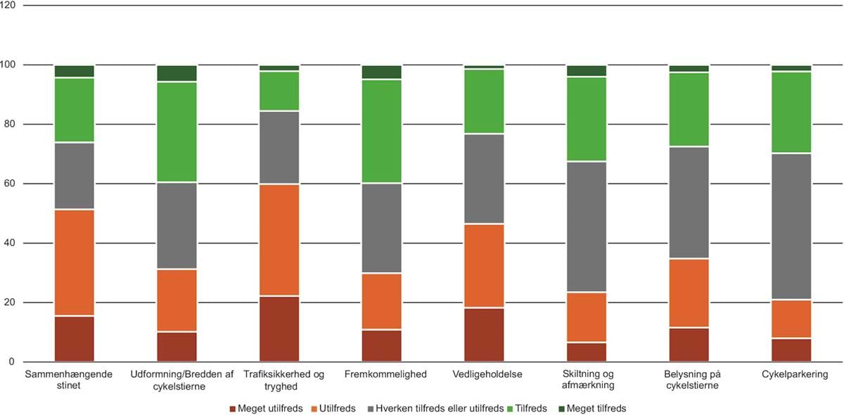 Der er en betydelig variation i den overordnede tilfredshed med forskellige cykelforhold i Ringsted Kommune. Den største utilfredshed ses primært hvad angår trafiksikkerheden og trygheden på veje og stier. Der er også en bemærkelsesværdig mangel på tilfredshed med sammenhængen i stinettet samt vedligeholdelsen af cykelstierne. På den positive side er der en relativt høj grad af tilfredshed med både fremkommeligheden og udformningen af cykelstierne.