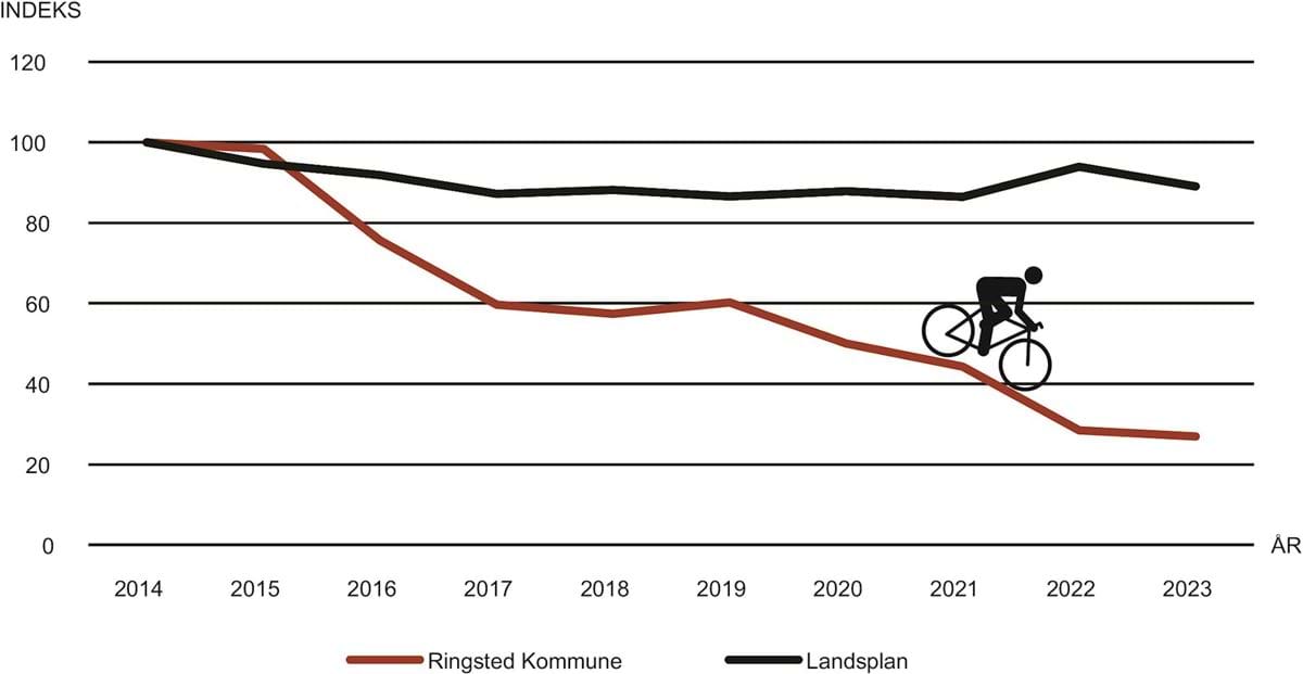 I perioden 2014-2023 har cykeltrafikken i Ringsted Kommune oplevet et markant fald på lidt over 70 %. Faldet er betydeligt større end den generelle tendens på landsplan, hvor cykeltrafikken generelt falder, især uden for de største byer i Danmark.