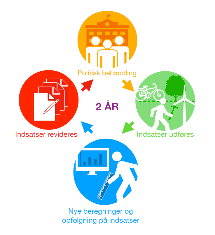 Klimaplanen forventes revideret hvert fjerde år, i forhold til opnåelse af 70% reduktion i 2030, og neutralitet i 2045, og et forslag til revision eller tillæg til klimaplanen vil blive forelagt til politisk behandling og efterfølgende offentliggørelse. Den digitale udformning af klimaplanen skaber dog også mulighed for løbende revision af dele af planen, hvis det som en del af arbejdet giver bedre mening.