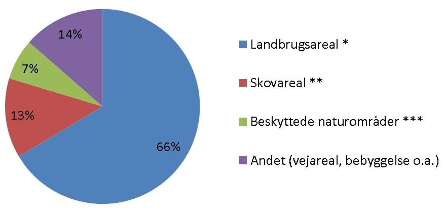 Figur 3.1.2. Fordeling af landbrug, skov, §3-natur samt by, vej og anlæg i Danmark, ifølge Danmarks Statistik 2012. De beskyttede naturområder er hér områder, beskyttet efter naturbeskyttelseslovens §3.