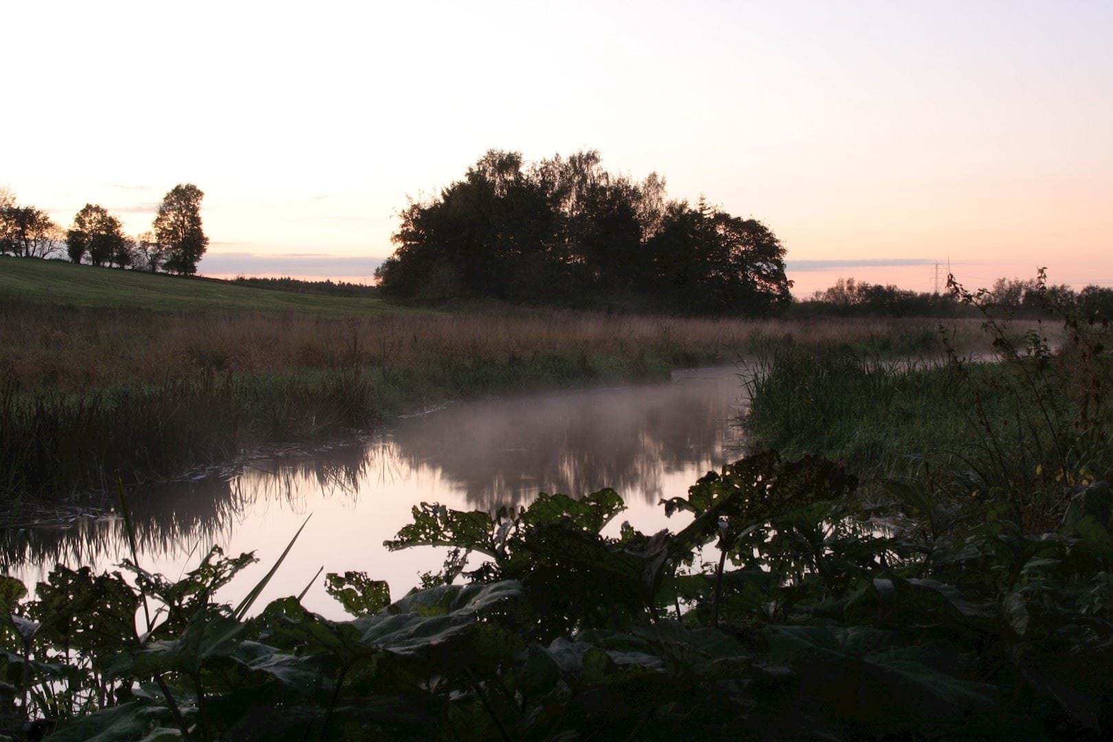 Ringsted Å ved Havemøllebro en oktober-aften. Ringsted Å og Suså binder mange naturområder sammen. Vandet er levested for mange planter, fisk og smådyr, samt en del fugle og enkelte pattedyr. Moser og enge rummer andre arter og de sandende åbrinke med overdrevsvegetation helt andre igen. Foto: Jon Feilberg.