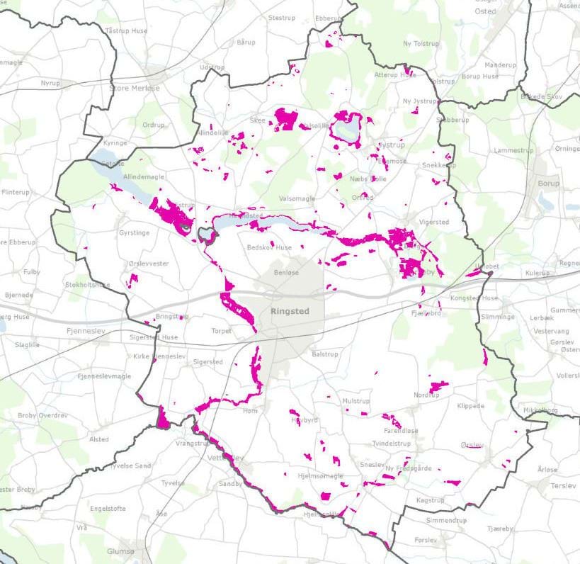 Kortet i figur 4.3.3.3.3 viser §3-besigtigede søer og vandhuller og angiver, hvor stor en del af deres vandhulsbred, der er væsentligt skyggepåvirket.