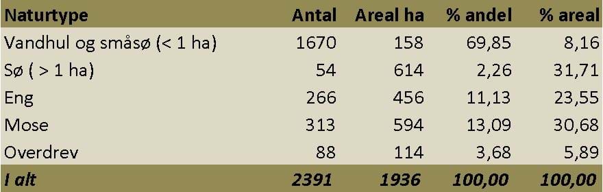 Af figurene 3.3.2, 3.3.3 og 3.3.4 ses, at der i kommunen er 54 søer der er større end 1 ha. De dækker tilsammen 32 % af det totale §3-areal. Desuden er der 313 moser (31 % af det totale §3-areal), 266 ferske enge (24 % af det totale §3-areal) samt 88 overdrev (6 % af det totale §3-areal).