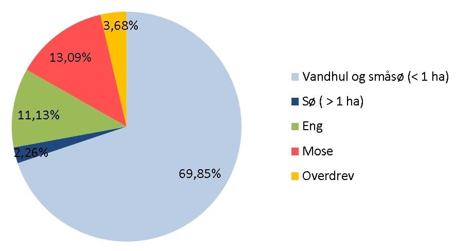 I alt er der registreret 1.670 vandhuller og småsøer (1 ha eller derunder) i Ringsted Kommune (figur 3.3.2). Det svarer til 70 % af alle §3-områder i kommunen. Arealmæssigt udgør vandhuller og småsøer dog kun en lille del, svarende til 8 % af det totale §3-areal.