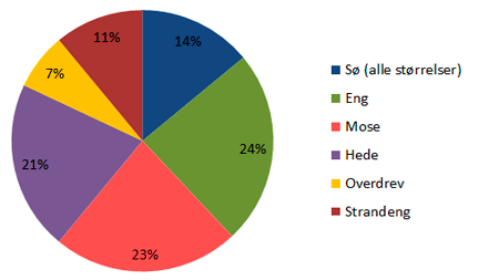 Figur 3.3.5. Procentvis fordeling af §3-områdernes samlede areal i hele Danmark. Data fra Danmarks Miljøportal, kortlag 'Beskyttede naturtyper', 08-2012.