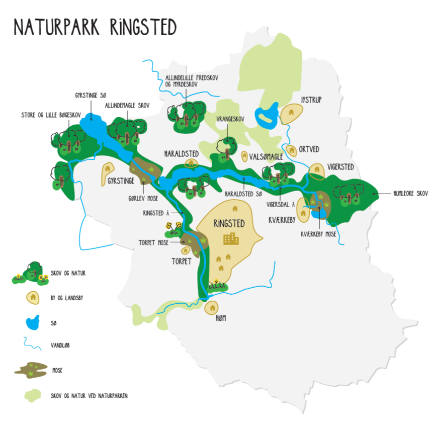 Naturpark Ringsted er vist på kortet med en mørkegrøn signatur. Der er værdifulde naturarealer og skove omkring naturparken. Disse områder er markeret med en lysere grøn signatur på kortet.