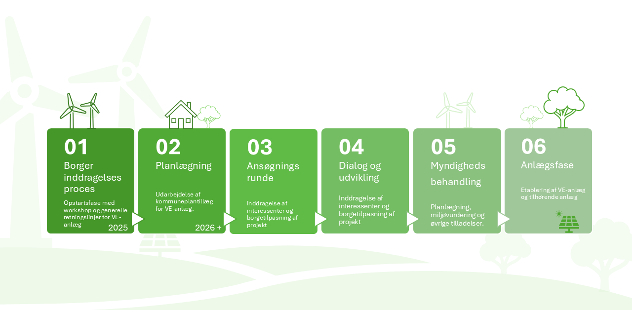 Forløbet for den nuværende proces, fra idéudvikling til at etablere VE anlæggene, er delt ind i fem faser, som forløber over flere år. I 2025 har byrådet besluttet at vi arbejder i fase 01, som hovedsageligt vil indebære idéudvikling og udarbejdelse af rammer og retningslinjer for den kommende kommuneplantillæg for VE-anlæg, som danner plangrundlaget for behandling af de kommende ansøgninger. Først derefter vil der blive åbnet op for behandling og prioritering af ansøgninger til specifikke projekter fra udviklere (tidligst start 2026). Det vil sige, at der i hele 2025 ikke vil blive taget stilling til konkrete projekter for kommunen, men kun blive udarbejdet retningslinjer for hvor og hvordan sådanne projekter kan se ud.
