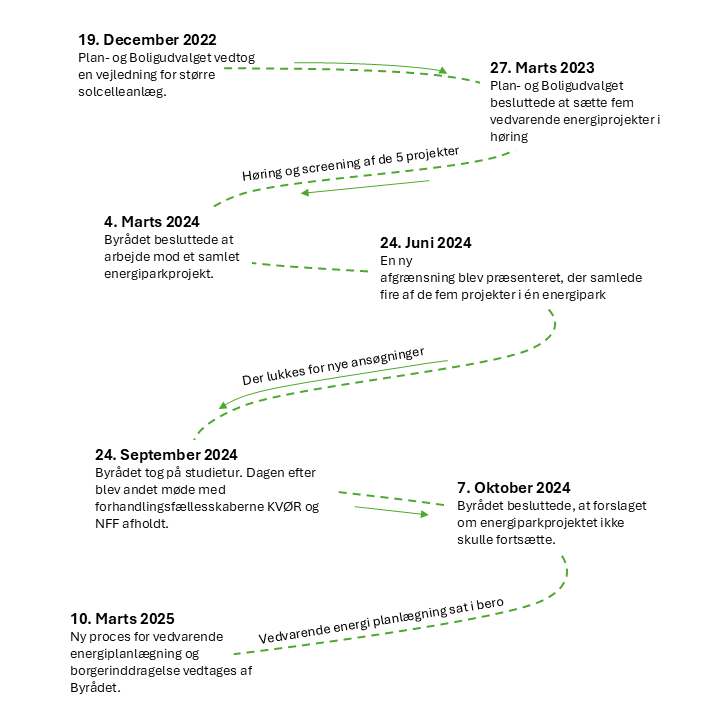 Siden vedtagelsen af Klimaplanen har der været stor fokus på planlægningen af vedvarende energi i Ringsted Kommune. Undervejs har der været flere justeringer og tilpasninger, i takt med at nye input og hensyn er kommet til. Det kan have gjort processen lidt svær at følge - måske du selv var der. Her får du i hvert fald et kort overblik over, hvad der er sket siden den 19. december 2022.